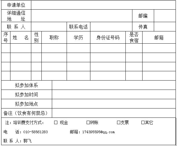 请拟参加培训班人员请以电子邮件或传真方式将报名表传达我方,报名时需携带本人身份证、1寸彩色照片。