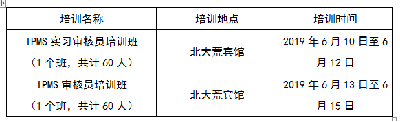 IPMS审核员培训班,培训费用2800元/班/人,包括培训费、考试费、教材资料费等,培训期间交通食宿自理。