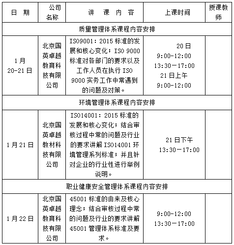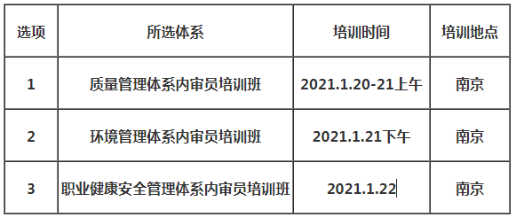 欢迎您参加2021年第一季度南京地区 “新版质量、环境、安全管理体系内部审核员”培训班,现将报到时间、地点及相关事宜通知您,望收到后回复确认。