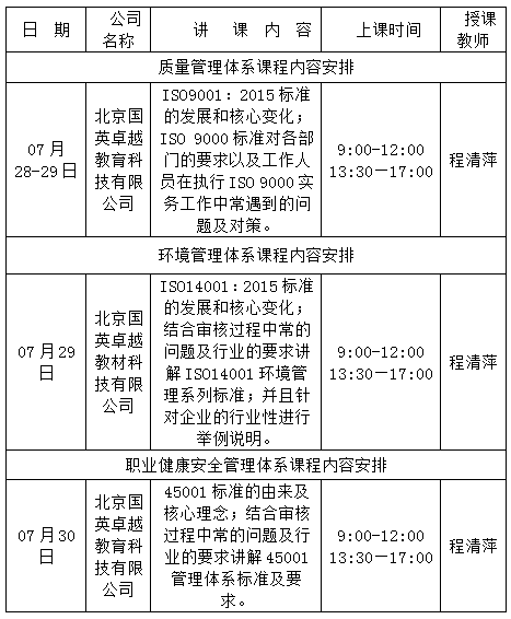 ISO组织相继发布了ISO9001:2015版标准、ISO14001:2015版标准、ISO45001:2018版标准。本次新版标准修订属于技术型改版,新版标准对标准的术语、章节架构和条款内容均作了较大幅度的技术修订。新版标准在管理理念、思维模式上有了重大调整,新增了理解组织及组织情境的要求,被喻为面向未来25年的管理体系标准。为了满足广大获证企业第一时间了解新版标准修订内容及要求、做好换版工作的需求,北京国英卓越教育科技有限公司针对新版标准的变化精心设计“质量管理体系(GB/T19001-2016)、环境管理体系(GB/T24001-2016)、职业健康安全管理体系(GB/T45001-2020)三体系内审员培训课程”,目的是通过对新版标准的培训,让获证组织深刻理解新版标准的核心变化思想,提前策划获证组织新版标准转换工作,进一步深化企业管理体系的运行,使获证客户在企业管理方面再上新台阶。相关培训事宜如下: