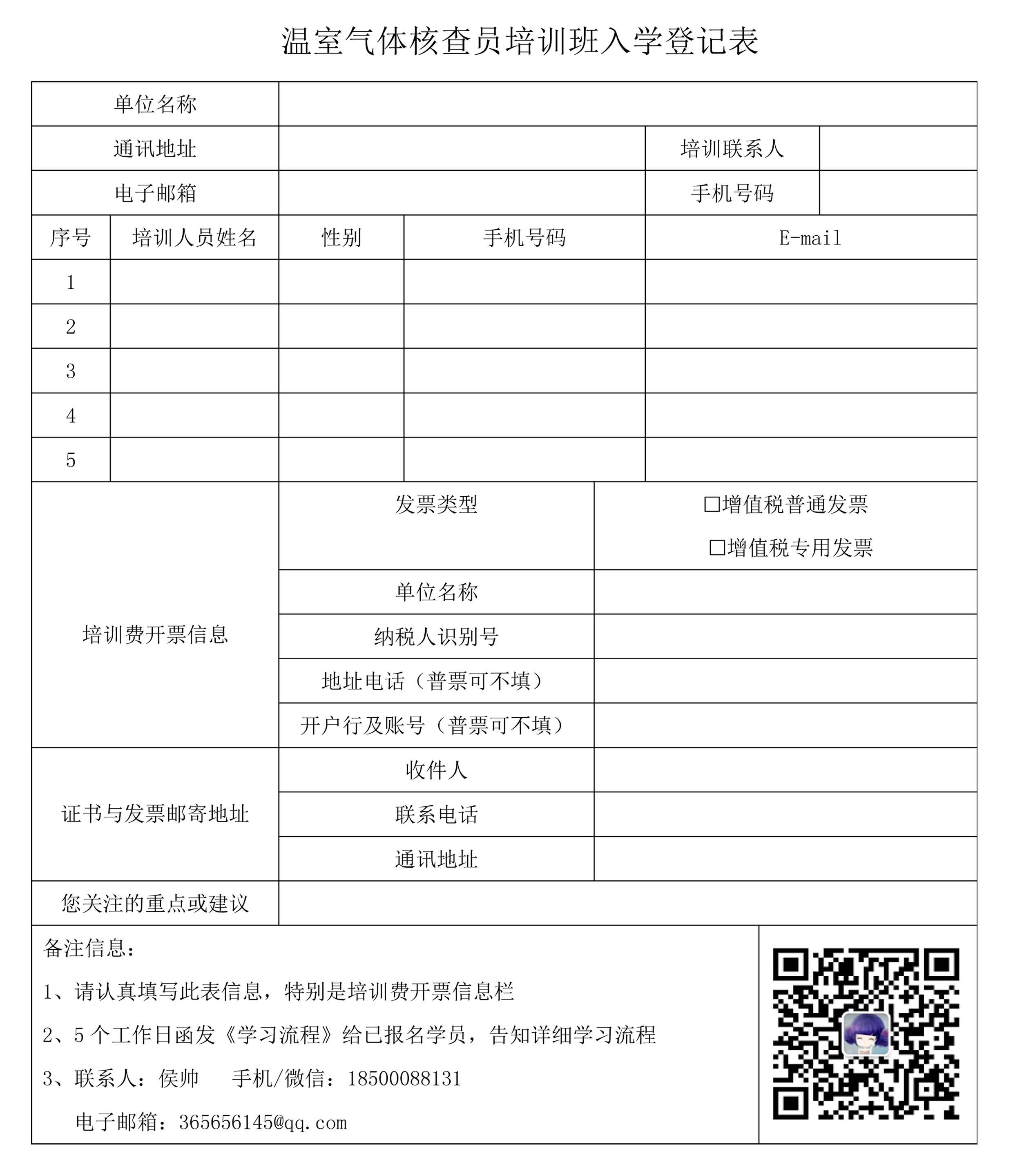 参加报名学习人员,填写《温室气体核查员培训班入学登记表》电子档后发送至报名邮箱(邮箱:365656145@qq.com),原件现场报到时提交。