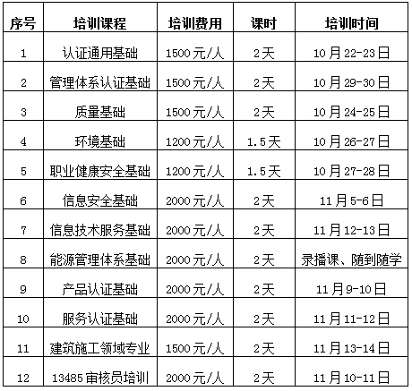 GYZY根据,中国认证认可协会(CCAA)修订并发布的《管理体系审核员注册准则》及《新版认证人员注册考试大纲》,为了满足社会各界、广大考生的需求,提高考生对标准的理解能力和应试能力,GYZY决定于2022年9-12月以网络/面授形式举办“审查员、检查员、审查员考前“认证通用基础”、“管理体系认证基础”、“质量/环境/职业健康安全管理体系认证基础”、“信息安全/信息技术服务基础”、“产品认证基础”和“服务认证基础”等系列课程。现将培训事宜通知如下: