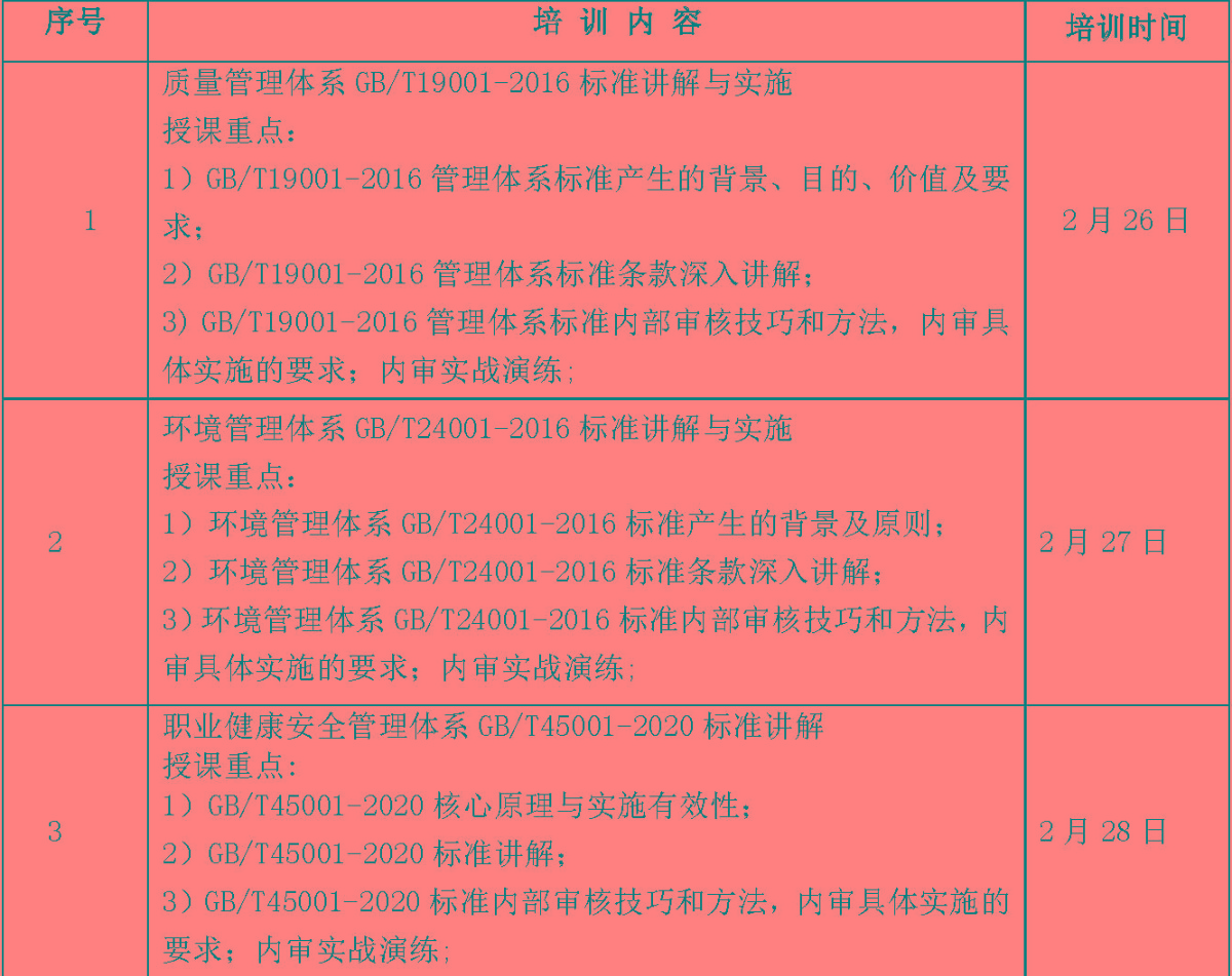 为落实贯彻执行国务院〔2022〕30号“提高认证服务能力,加大认可和检测检验改革创新力度”文件精神,认真学习领会“十四五”市场监管现代化规划,加快构建统一管理、共同实施、权威公信、通用互认的认证体系,全面提升认证服务能力,北京国英卓越教育科技有限公司决定举办质量管理体系(GB/T19001-2016)、环境管理体系(GB/T24001-2016)、职业健康安全管理体系(GB/T45001-2020)三体系内审员培训班。旨在通过培训,让获证客户深刻理解标准的丰富内涵,增强运用标准的能力,引导企业自觉地将标准与生产经营有机结合,将标准融于日常经营管理活动中去,深化管理体系的运行,使管理体系成为提高企业绩效的工具,助推获证客户管理再上新台阶。现将培训事宜通知如下: